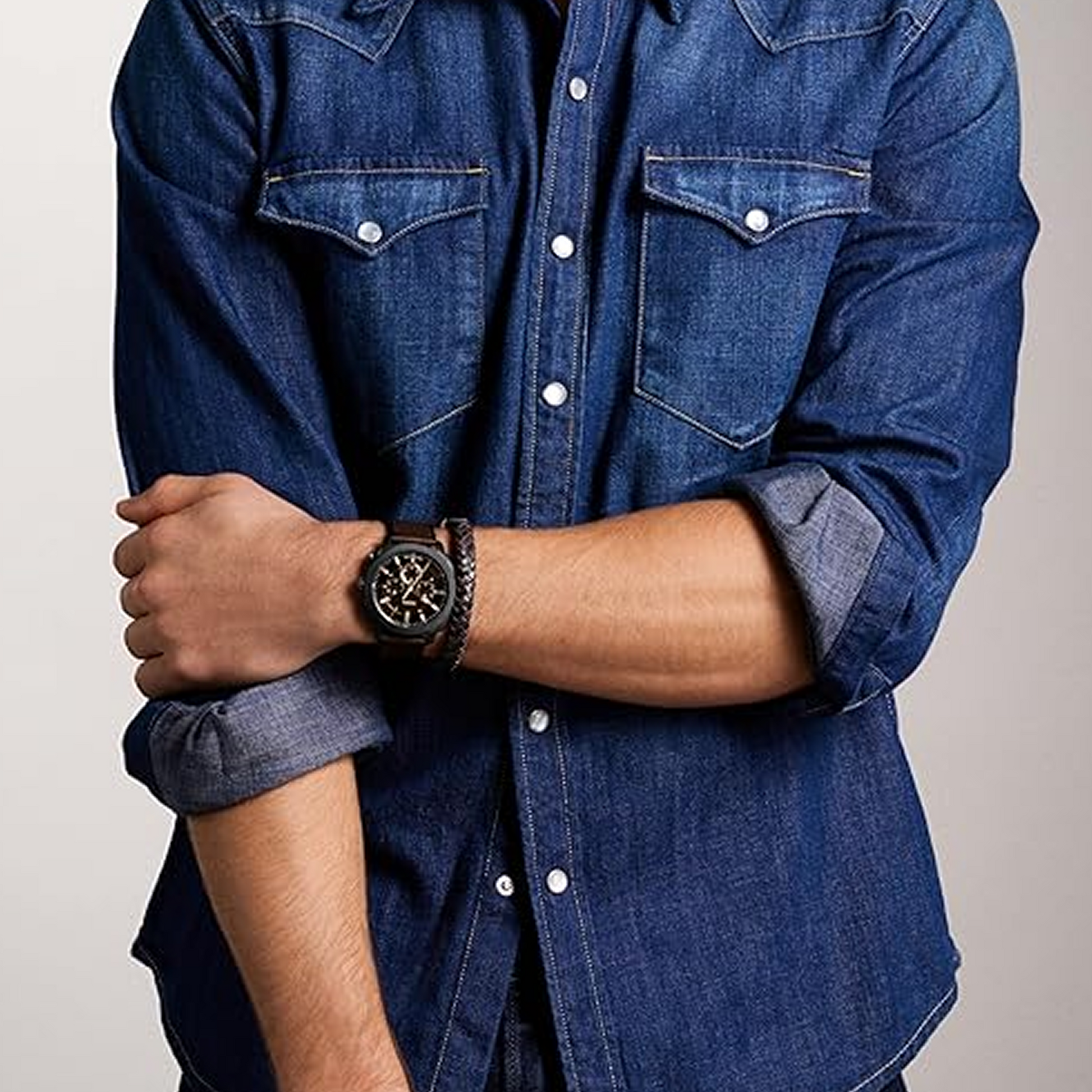 Elevate your wristwear with this rugged yet refined Foossiil men's chronograph watch. Featuring a black dial with rose-gold accents and a textured bezel, the design balances modern industrial aesthetics with vintage charm. The genuine brown leather strap adds comfort and character, making it a timeless piece for both casual and formal settings.